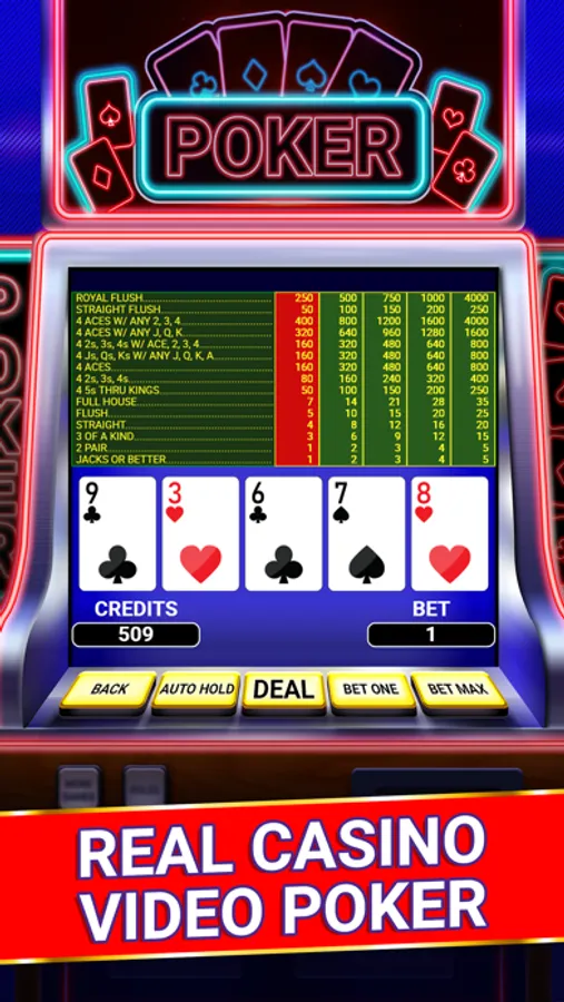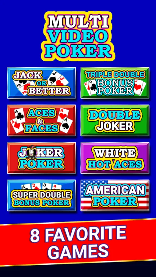 - 8 Video Poker Games Variants in 1 Casino App: Classic Jacks or Better, Aces & Faces, Joker Poker, Super Double Bonus Poker, Triple Double Bonus Poker, Double Joker, White Hot Aces and American Poker!