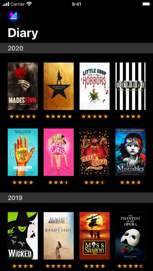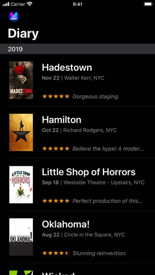 * Log your theater visits in Mezzanine's diary. Watch your theater history come to life with original poster art and accurate production details.