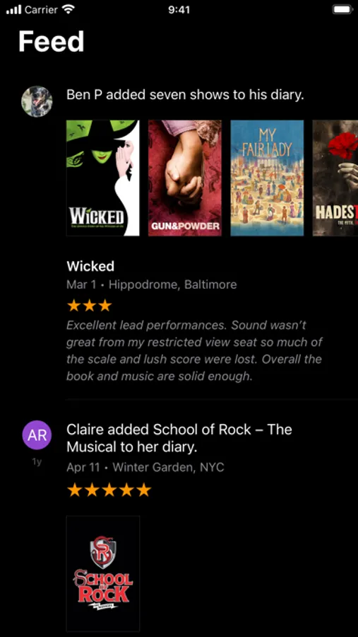 * Follow your friends to see their latest theater trips and reviews.