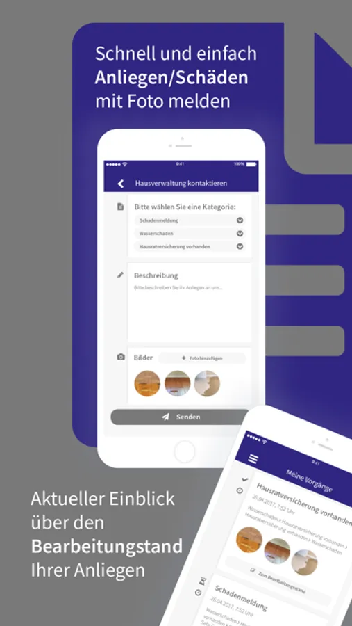 Als Mieter oder Eigentümer können Sie Schäden oder Anliegen direkt mit Fotos über unsere App melden. Ihre Anfragen stehen unseren Mitarbeitern dann zur Bearbeitung zur Verfügung und können auch an Handwerksbetriebe weitergeleitet werden.