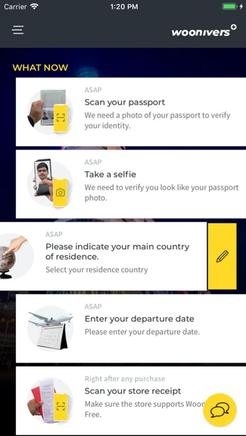 Just install the app and sign in. Whenever you buy something in a store associated with Woonivers, get your ordinary sales receipt and, as soon as possible, scan it with the app. We will make sure that the store issues a tax refund request that will be stored in your app as a visual code.
