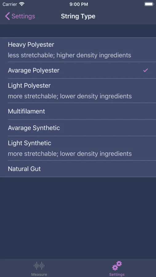 • Parameters to preset: head size; string pattern; main and cross string thicknesses and types; string opening size; stringing type. If some of them are not defined, the app will use the average default values or the last values the user put.