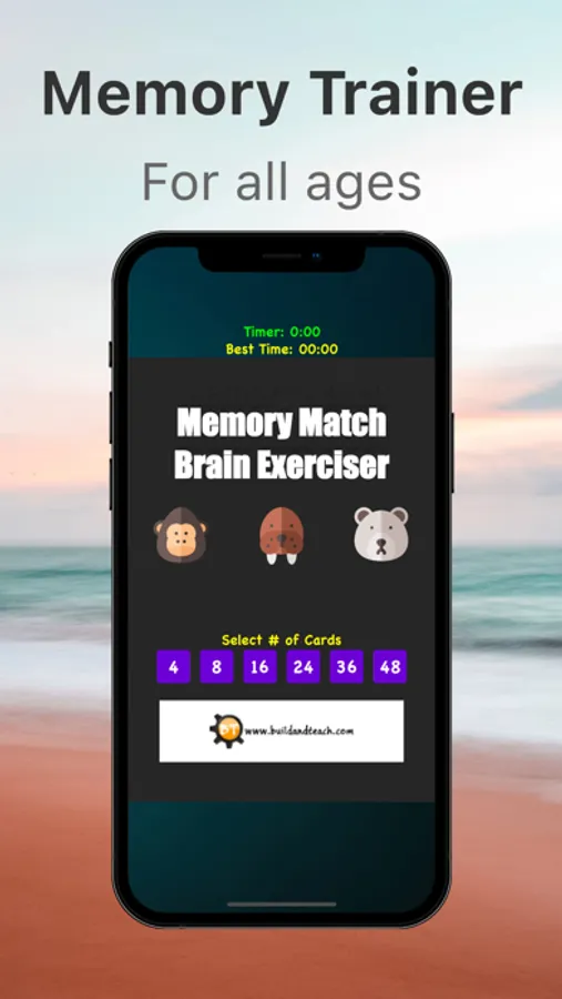 Train your brain with this classic memory exercise. Each set is randomized and you have the ability to choose 4 to 48 random cards. Great for kids, adults and the elderly. Simple interface allows you to change the number of cards. Compete against your best time. Great memory trainer. Great kids game to keep the kids busy on a road trip. Great for hand eye coordination. Great for training hand eye coordination. Pre-school, vacations, elderly care facilities.