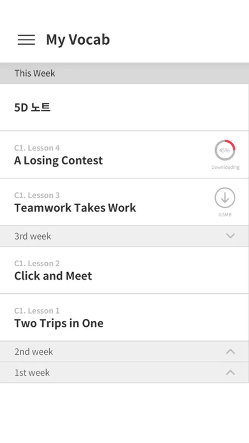 i-Learning에서 학습한 단어를 다시 학습할 수 있고, Review Test에서 틀린 오답을 5D 노트 메뉴에서 확인할 수 있습니다.