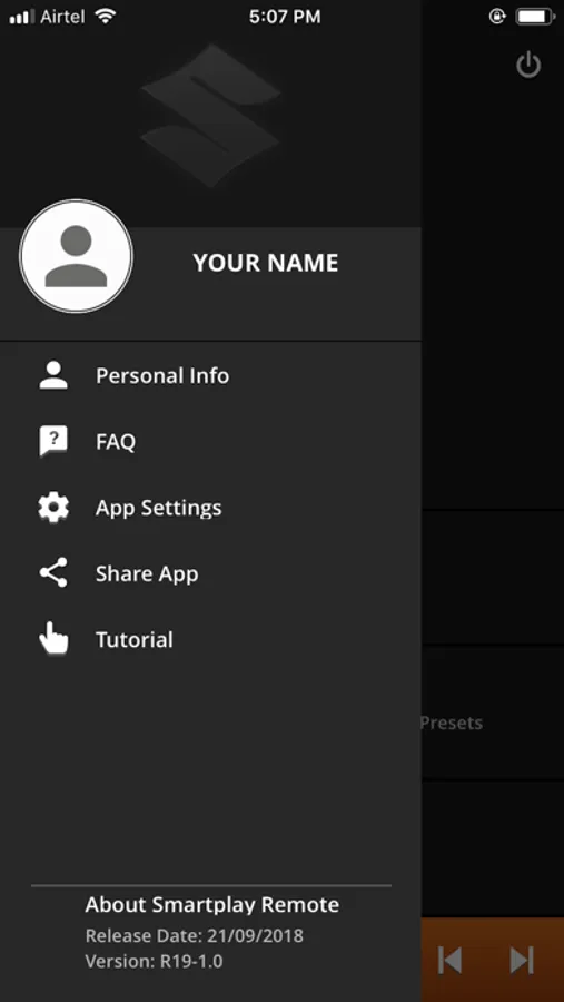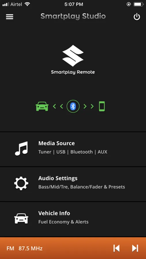 An app that connects to the Maruti Suzuki SmartPlay Studio infotainment system over Bluetooth. Using the app, user can control certain functionalities of the SmartPlay Studio, e.g., changing the tuner station, changing the media track, changing the display mode of the SmartPlay Studio etc. It also provides certain information to the user received from the SmartPlay Studio, e.g., any alerts related to the vehicle, fuel efficiency information etc. This app shall work only with select range of Maruti Suzuki models and audio systems.