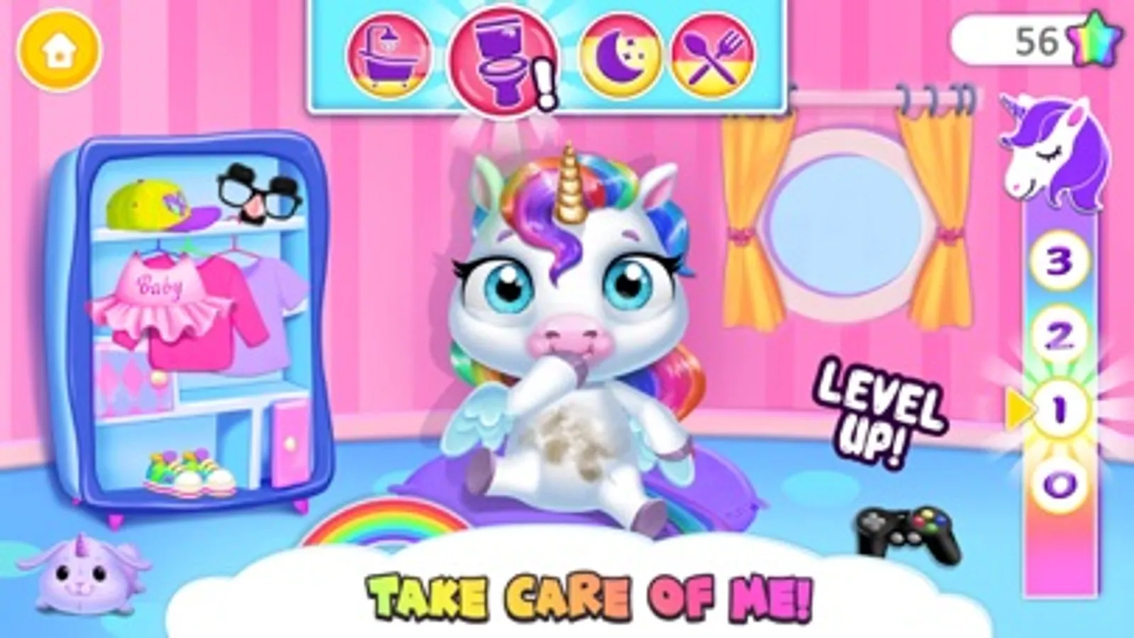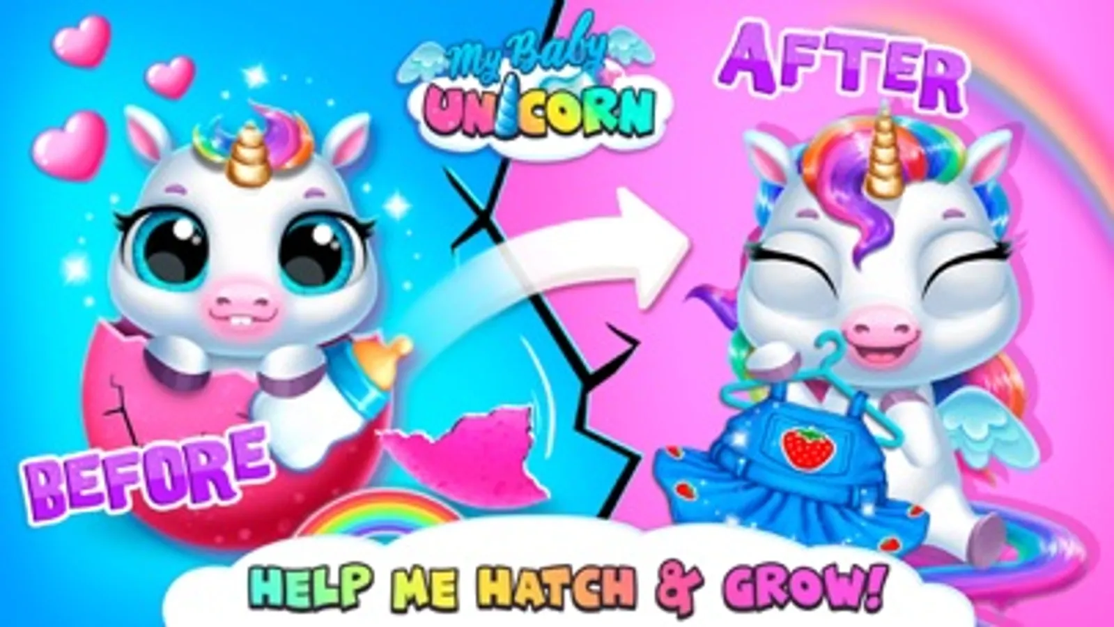 You got a gift - a super cute virtual unicorn baby! Become the best magical pony nanny! Hatch a colorful egg and take care of the cutest newborn unicorn with rainbow hair! Bathe, feed, potty train, dress up, sing to sleep and play fun games with your tiny virtual pet friend! Decorate the baby unicorn’s room with rainbow colors! Play My Baby Unicorn virtual pet care game for kids every day and watch your virtual pet pony grow!