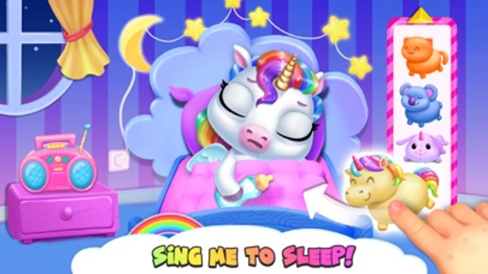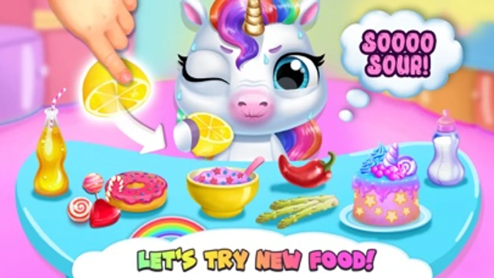 Feed your baby unicorn fun and yummy foods: fruits, veggies, candies, donuts and even a cute unicorn cake! Give a squishy toy to your baby unicorn and sing the little one to sleep! Sweet dreams, baby unicorn!
