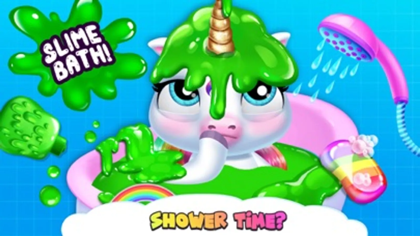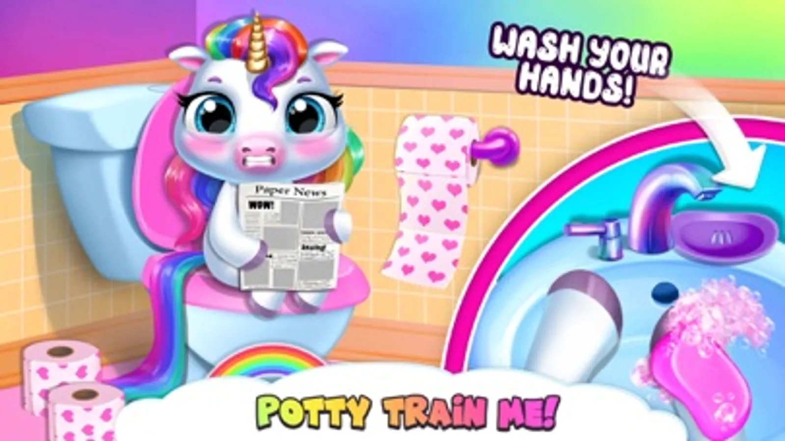 Your baby unicorn likes to be super clean! Bathe the little one and enjoy the magical pony’s fun reactions to rainbow soap or slime bath! Potty train your tiny unicorn pet and don’t forget to wash hands afterwards!