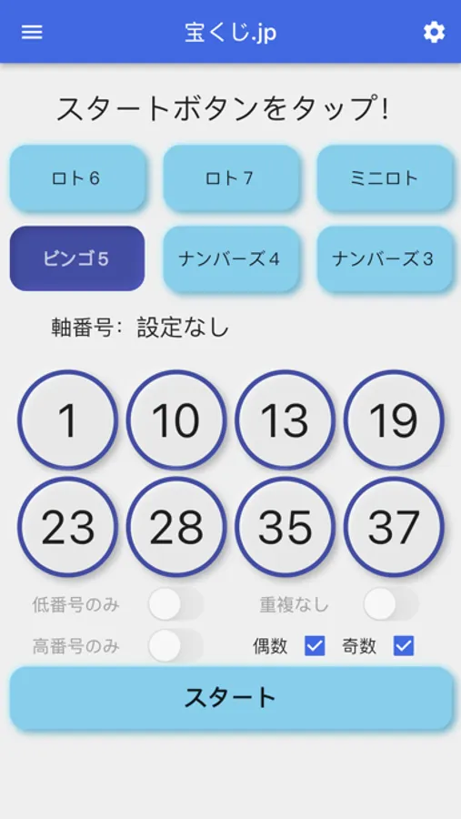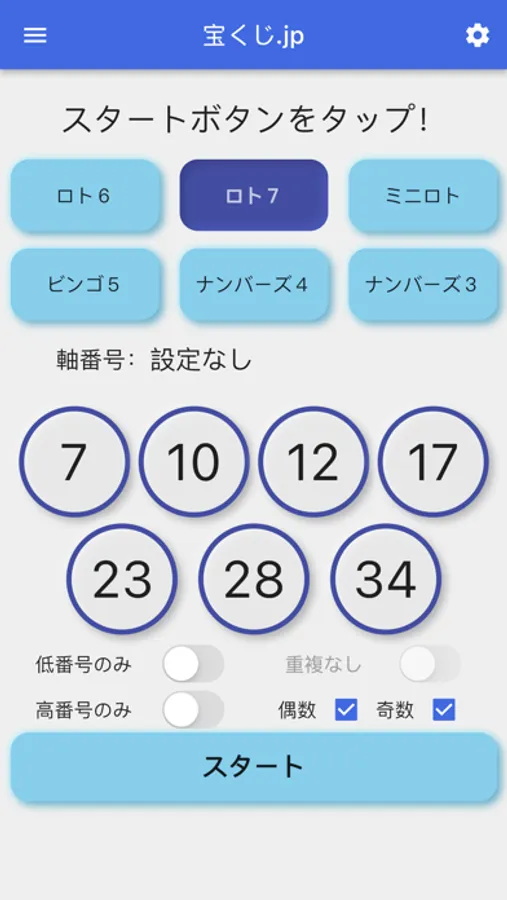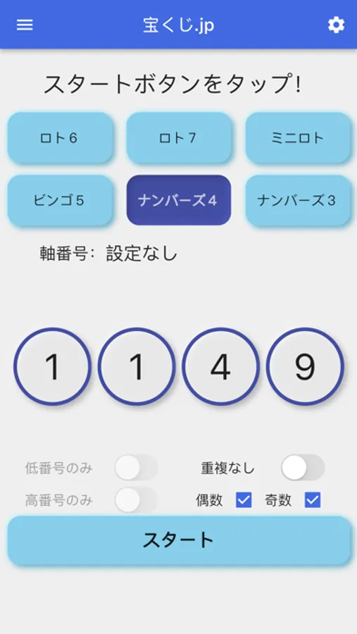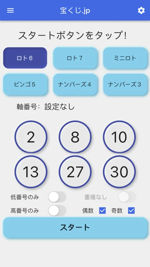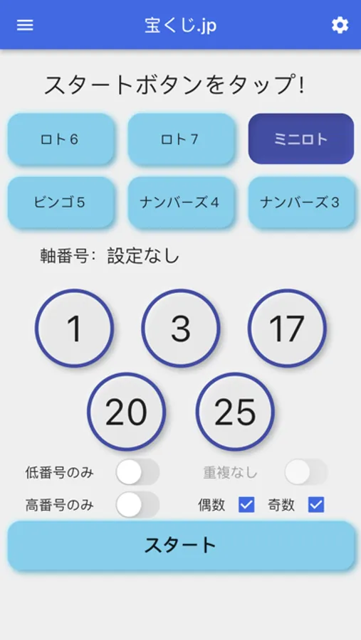 ロト6、ロト7、ミニロト、ナンバーズ3、ナンバーズ4にて「低番号のみ」「高番号のみ」の番号を発生できます。