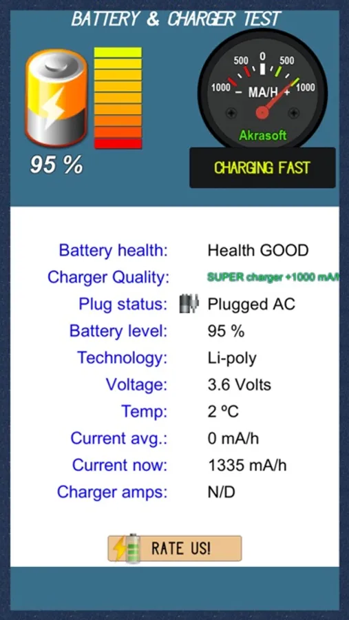 With this simple free app you can measure the consumption of your device, check the battery and check the charger. Displays the load percentage. This app detects when the charger is fast or slow, if it is low or high quality, it is the perfect doctor of your terminal.