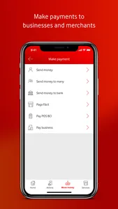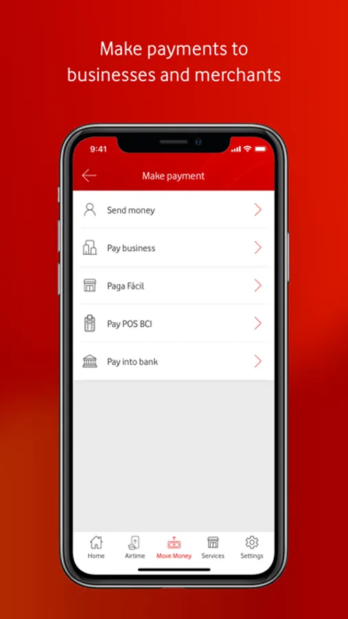 Transfer money from your mobile wallet to a bank account of Standard Bank, BCI or Millennium Bim, and also from your bank account back to M-Pesa.
