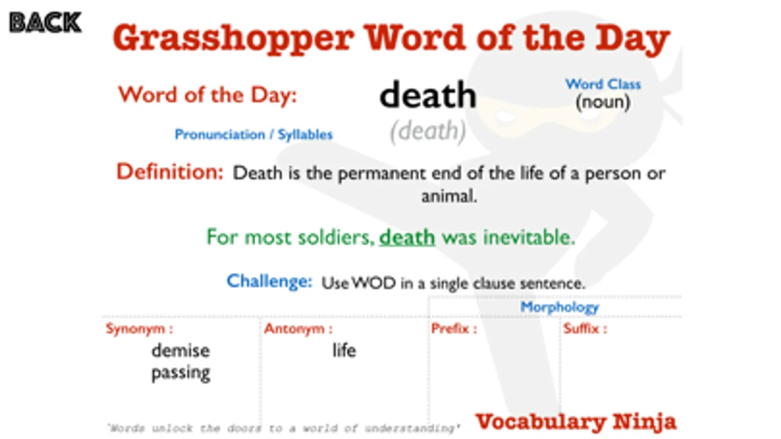 Each day the Word of the Day app will provide a Grasshopper and Shinobi level word. Grasshopper is primarilly a simpler word for children to understand and apply, whereas the Shinobi level word will be more complex.