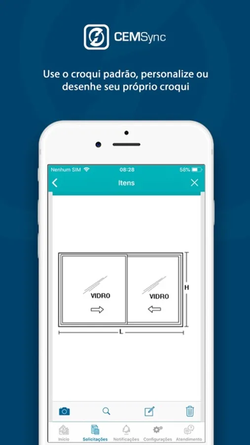 - Desenhar diretamente no app o modelo de esquadria que fará parte da solicitação;