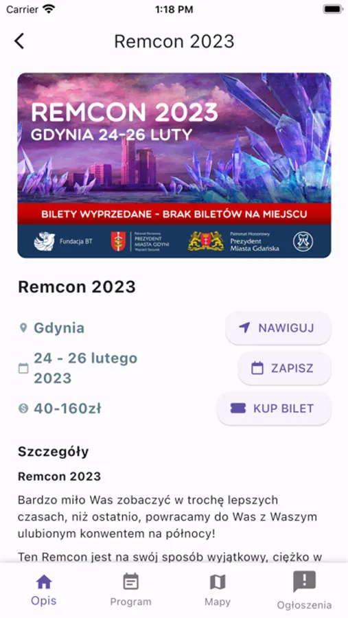 Aplikacja zawiera listę konwentów wraz z całym harmonogramem oraz inne przydatne rzeczy:
