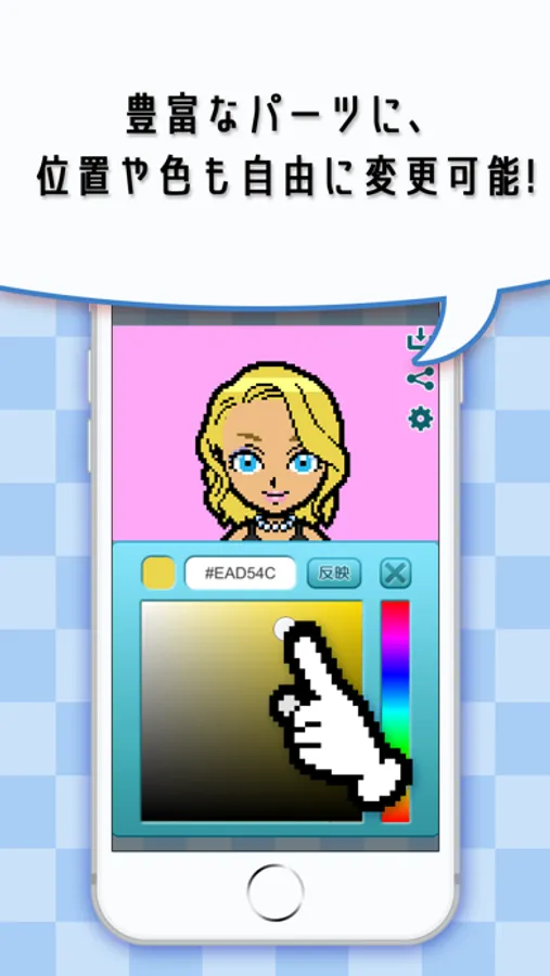 カンタン操作でかわいいドット絵のにがお絵が作れます。豊富なパーツに、位置や色も自由に変更可能です。SNSシェアにカメラロールへの保存も対応して。プロフィール画像にも使えます。