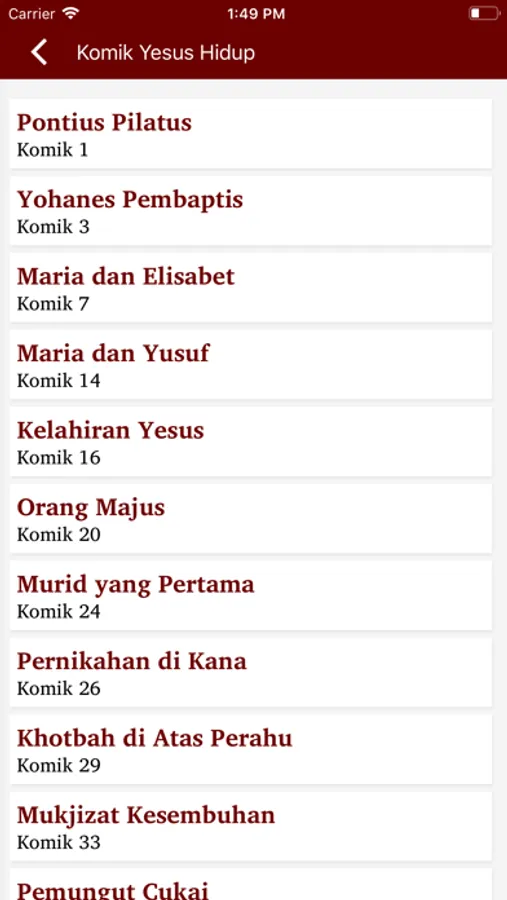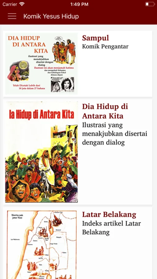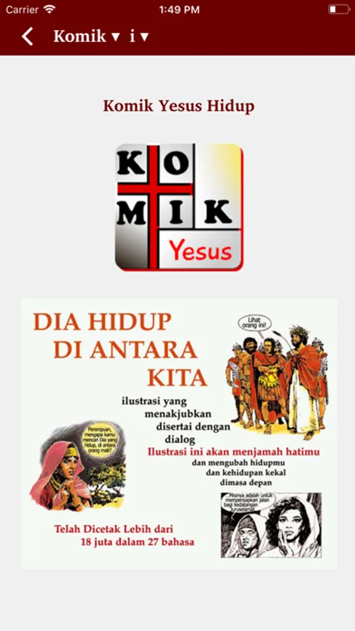 Aplikasi Komik Yesus Hidup berisi ilustrasi "full colour" yang membawa setiap pembacanya mengenal Pribadi yang sangat luar biasa ini. Dia dilahirkan lebih dari 2.000 tahun yang lalu dan masih hidup di antara kita hingga saat ini. Dia adalah Yesus, Sang Juru Selamat umat manusia. Komik ini berisi Kabar Baik yang dapat diterima oleh segala lapisan, dari anak kecil hingga orang dewasa. Cerita-cerita Alkitab ini telah diurutkan secara sistematis dari kisah kelahiran Yesus sampai kenaikan Yesus ke surga (127 halaman). Mari mengenal dan mengerti tentang Yesus, memahami ajaran-Nya, dan menemukan rencana Tuhan untuk dunia ini seperti yang tertulis dalam Alkitab.