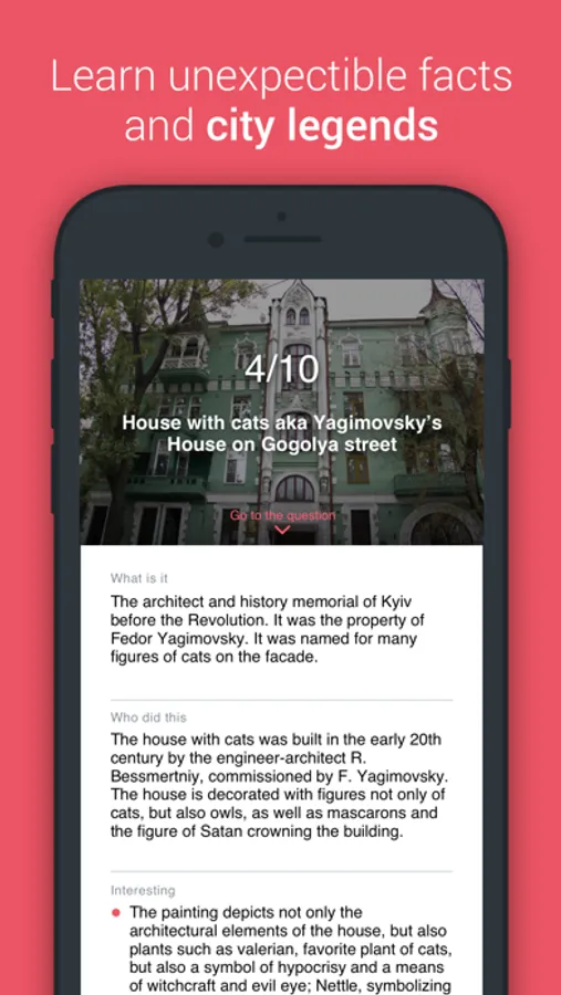 You will be able to look in a new way at the familiar places, learn a lot of interesting stories and legends, test your ingenuity by solving puzzles, and to get acquainted with the cities of Ukraine in the best way and adventurous atmosphere. In addition, in the application you can take cool photos and share your impressions on social networks.