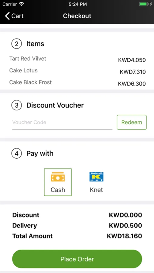•إختر طريقة الدفع المفضلة لديك إما اون لاين عبر الكي نت او الدفع نقداً عند توصيل الطلب