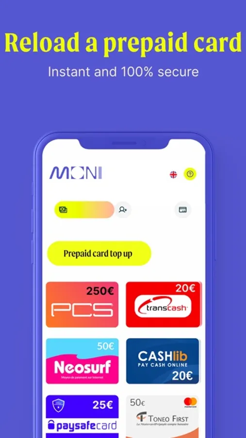 With MONI (ex Allo Monisnap) recharge a prepaid card (PCS, Transcash, Neosurf, Paysafecard, etc. in less than 5 minutes. Buy a prepaid card reload online in a simple, fast and secure way with card reloads ranging from 20€ to 250€.