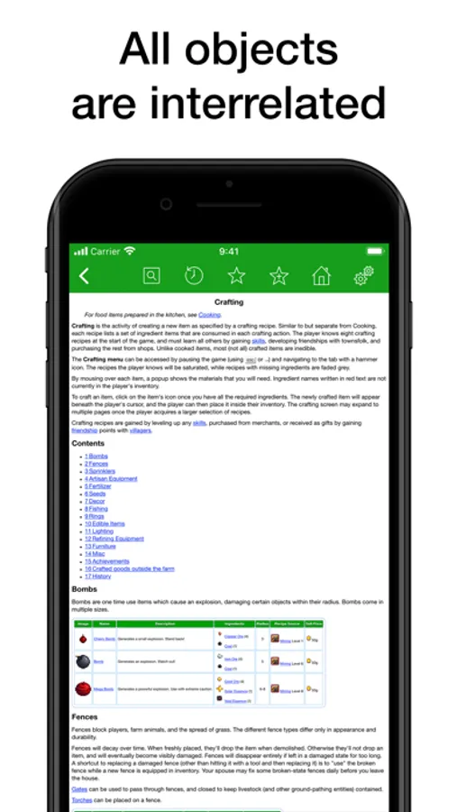 • All objects are interrelated, for example, by looking at a recipe to create an object, you can immediately go to an ingredient, and then go back or open some other object