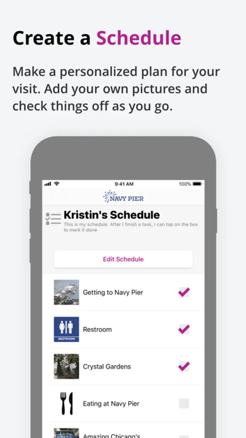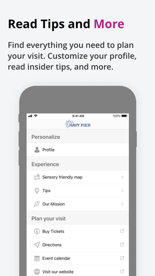 The Sensory NP app was developed to help families, especially young children and kids with disabilities, prepare for a day at Navy Pier. With the app, you’ll be able to learn more about Navy PIer, create your own schedule for the day, play the Navy Pier matching game and check out features like insider tips and our sensory-friendly map.
