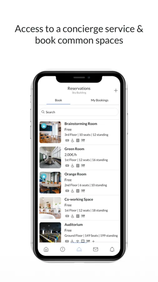 This all-inclusive mobile app dedicated to the building will allow you to access all the services offered in the common areas: concierge services, gym, food services, meeting rooms along with all the information related to the building life (events, messenger, forum).