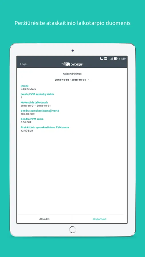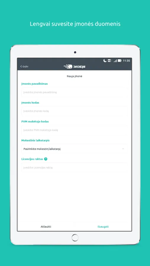 1. Atsidarius programėlę nustatymuose suveskite savo įmonės duomenis.