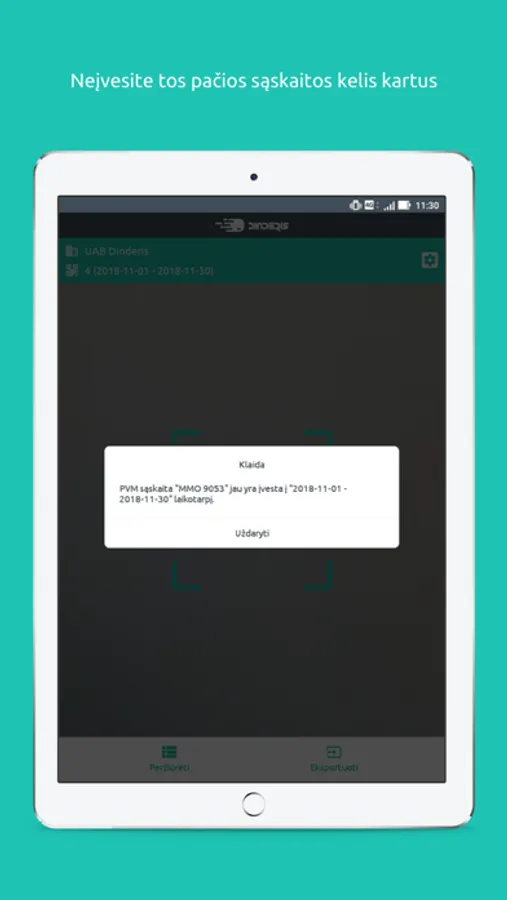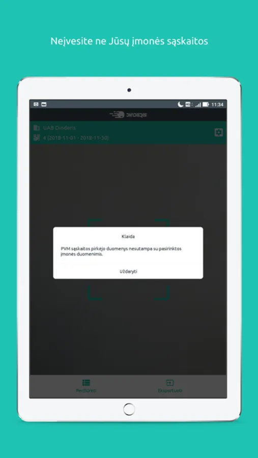2. Programėlė neleidžia nuskanuoti ne Jūsų įmonės vardu išrašytą sąskaitą - išvengsite