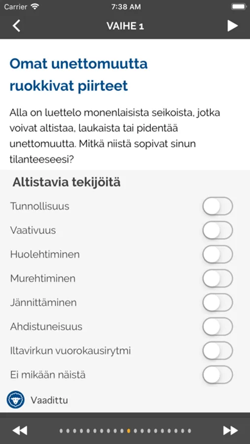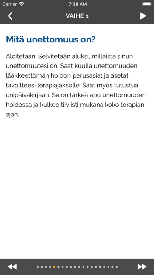 Unettomuuden nettiterapian Uniterapia-sovellus auttaa sinua irti unettomuudesta. Nettiterapiassa saat tietoa unen edellytyksistä ja harjoittelet tapoja auttaa unen tuloa ja vähentää stressiä. Unettomuuden selättämisessä sinua tukee myös oma nettiterapeutti, jonka kanssa voit viestitellä sovelluksen kautta. Sovellus on suunniteltu niin, että terapiaasi voidaan yhdistää tulevaisuudessa eri tietolähteitä kuten puhelimen Terveys-sovellus. Nettiterapia on tieteelliseen näyttöön perustuen tehokas apu unettomuuteen. Unettomuuden nettiterapia on tarkoitettu 16+ ikäisille, jotka kärsivät unettomuudesta.