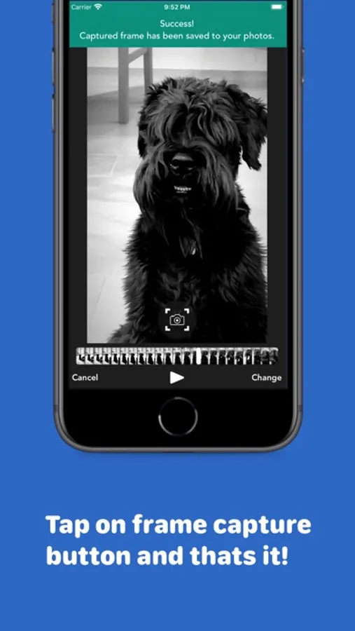 Just select a video from your video album and seek to desired frame. Tap screenshot button and now your frame is saved to photos library.