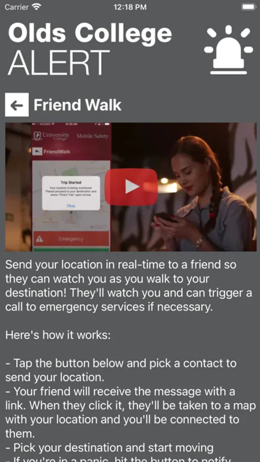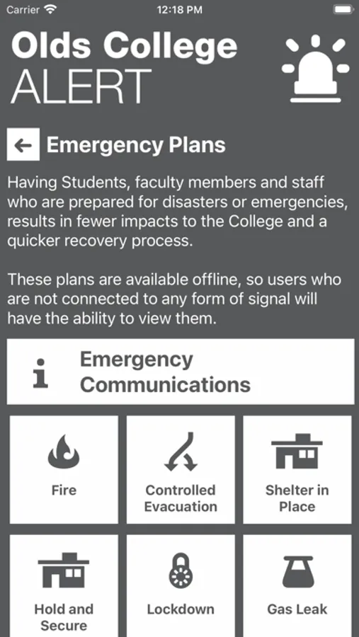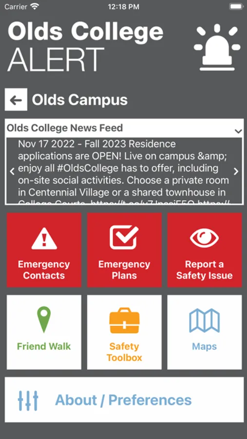 Olds College Alert is the official safety app of Olds College. It is the only app that integrates with Olds College's safety and security systems. Olds College Health Safety and Security department has worked to develop a unique app that provides students, faculty and staff with added safety on the Olds College campus. The app will send you important safety alerts and provide instant access to campus safety resources.