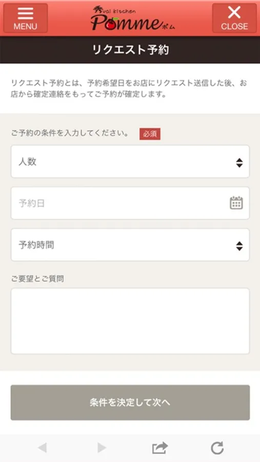希望の人数・日時を指定して送信するだけで予約を依頼できます。
