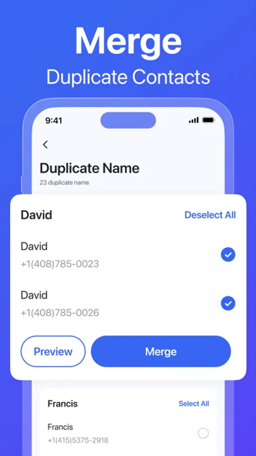 • Clean & organize contacts - Help you to delete & clean the same contacts in your list, and organize the unnamed contacts.