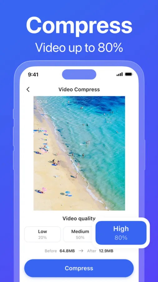 • Clean screen recordings & large videos - Easily find and get rid of large videos by setting up the threshold of video size, and delete them with simply one click so as to save space.