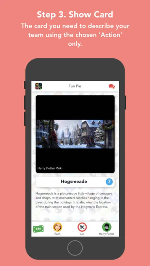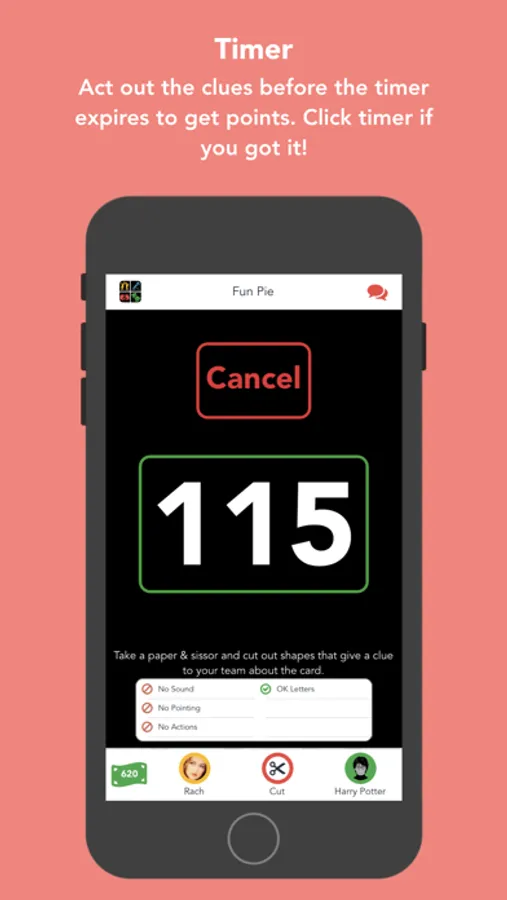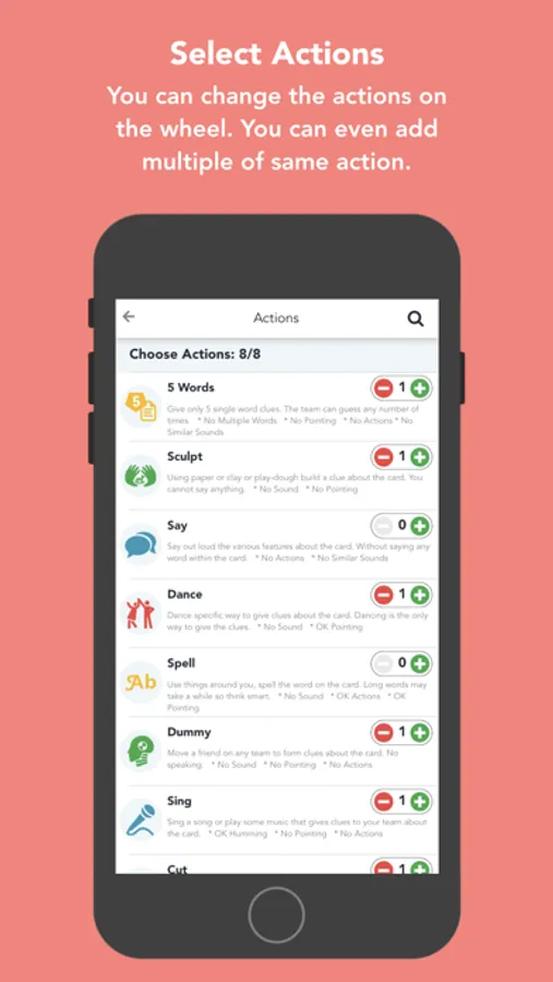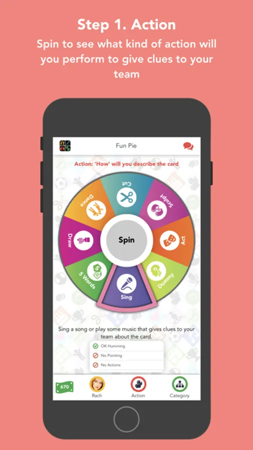 Just spin the 'Action' pie to get a random action (e.g. Cut), then spin the 'Category' pie to get a random category (e.g. Places - World). The person giving the clue sees the actual card (e.g. Eiffel Tower) belonging to selected 'Category'. Using the 'Cut' action, the team member cuts a paper with scissor to give his/her team mates clues about 'Eiffel Tower'. His/Her teammates can guess any number of times, but they better be quick, else the timer runs out.