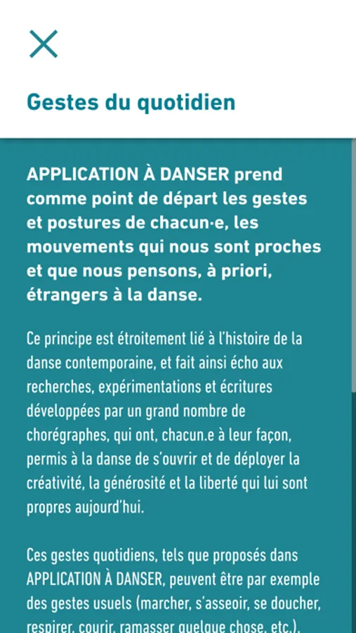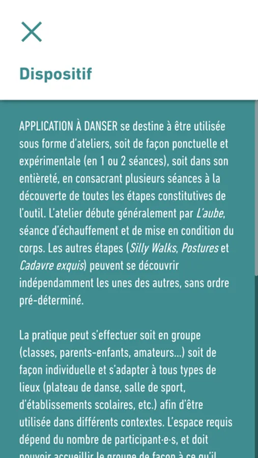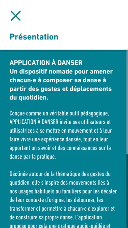 Application à Danser propose un nouveau modèle de diffusion de la danse via l’utilisation d'appareils mobiles. L’application, au centre du projet, permet à la fois d’enregistrer une séquence chorégraphique du point de vue du performeur et de la restituer sous forme de protocole composé de consignes et de feedbacks sonores.