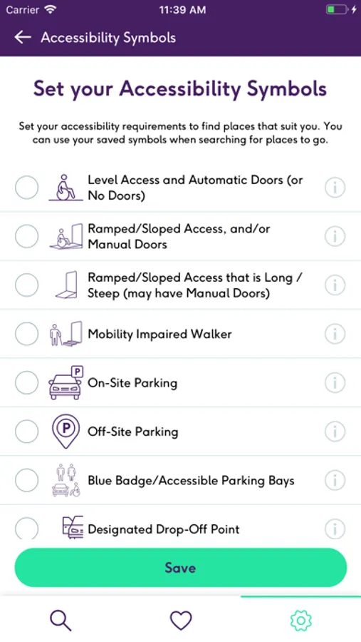 Set your Access Symbols so that you can prioritise places that meet your personal access requirements