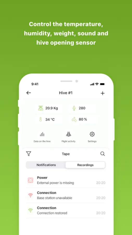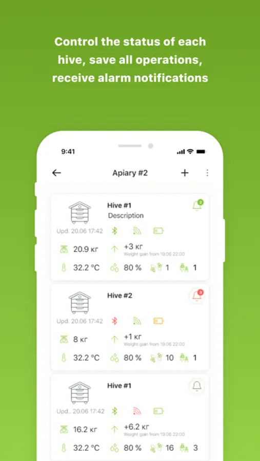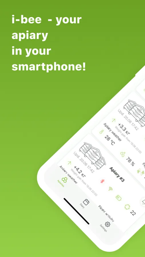 The i-bee application captures and transmits complete information about the condition of your apiary. Control of weather conditions in the apiary - temperature, humidity, wind, precipitation. Fixation of the state of each hive - temperature, weight, sound spectrum. Warning in case of theft or falling of the hive. Diary of a beekeeper, with the ability to create reminders then setting tasks to colleagues.