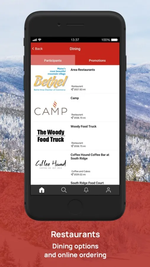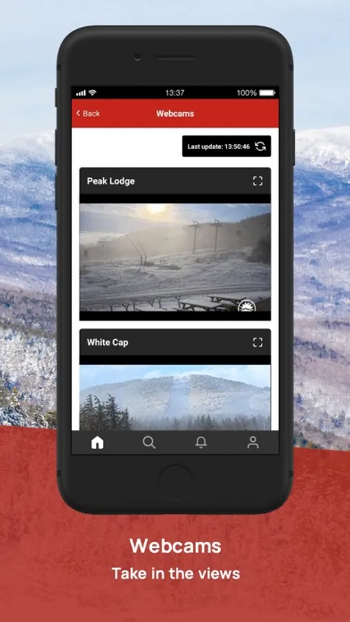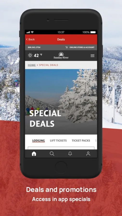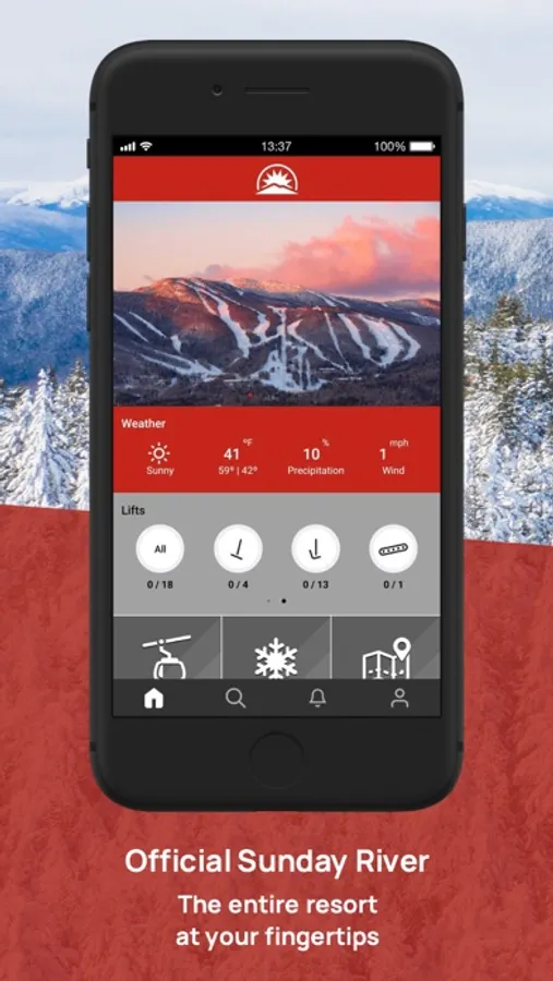 Optional push notifications include snowfall alerts, lift status updates, and on-resort deals.