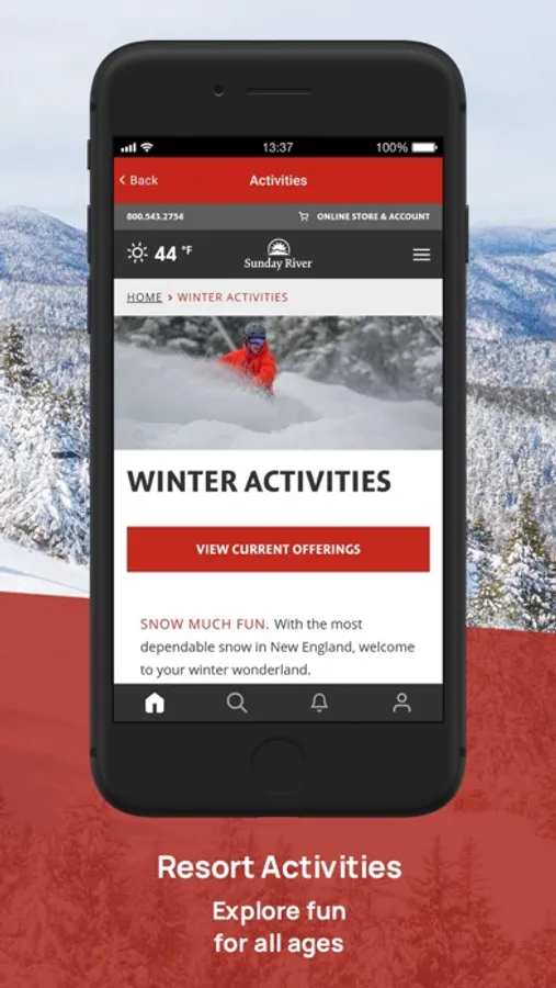 From home, you can use the app to check-in on Sunday River with weather updates, conditions reports, and several web cams. You can also plan your vacation with booking tools for lodging, lift tickets, tee times, and various activities.