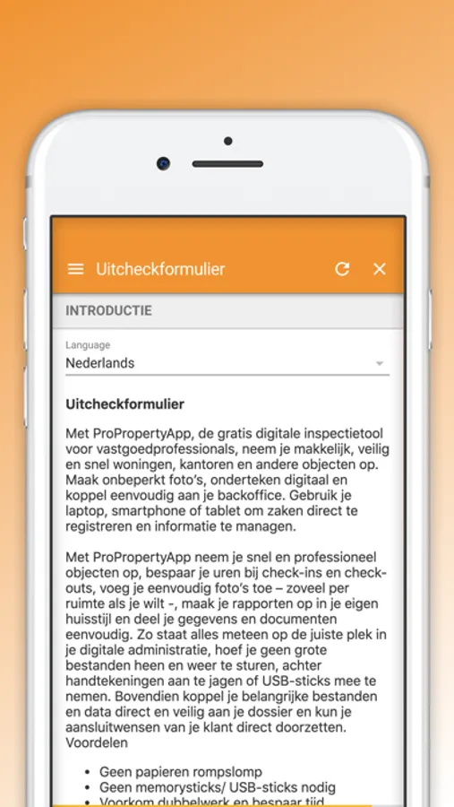 Met ProPropertyApp, de gratis digitale inspectietool voor vastgoedprofessionals, neem je makkelijk, veilig en snel woningen, kantoren en andere objecten op. Maak onbeperkt foto’s, onderteken digitaal en koppel eenvoudig aan je backoffice. Gebruik je laptop, smartphone of tablet om zaken direct te registreren en informatie te managen.