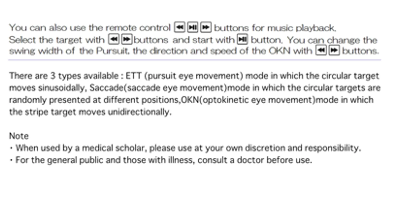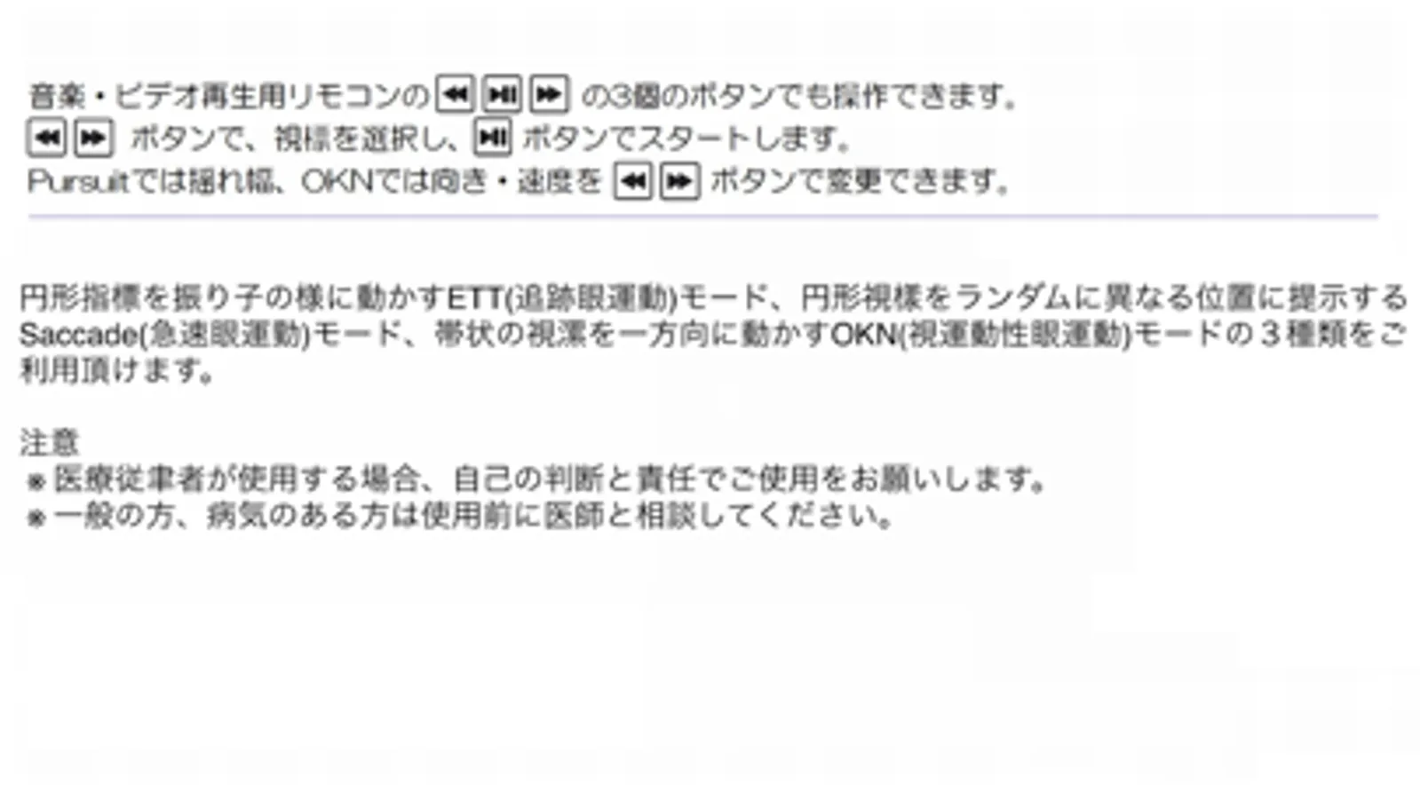 There are 3 types available: ETT (pursuit eye movement) mode in which the circular target moves sinusoidally, Saccade (saccade eye movement) mode in which the circular targets are randomly presented at different positions, OKN (optokinetic eye movement) mode in which the stripe target moves unidirectionally.