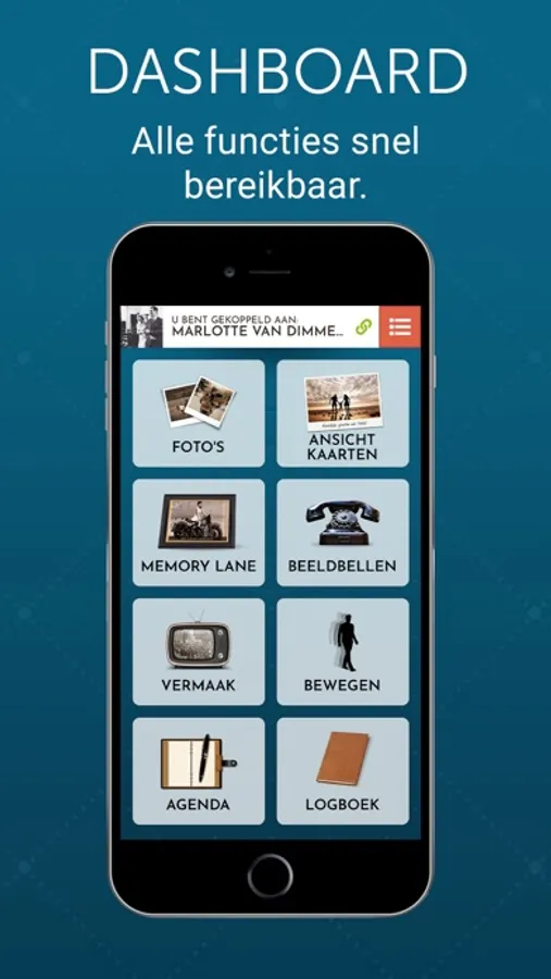 Via de mobiele Memory Lane App kunnen alle aangesloten gebruikers met de Memory Lane Tablet gebruiker beeldbellen