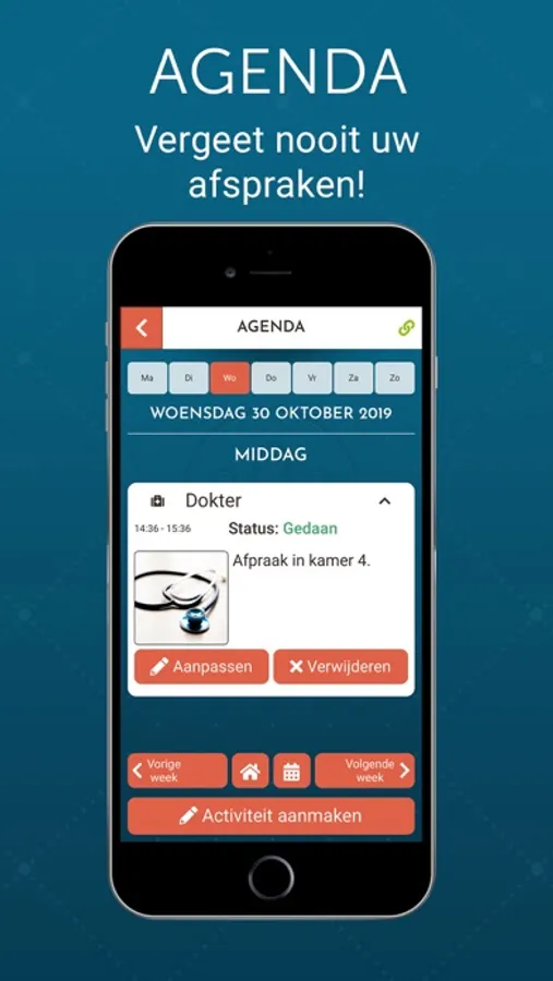 Samen met de hele familie de agenda beheren. Dit kunnen dagelijkse activiteiten zijn zoals bijvoorbeeld medicijnen innemen of bewegen, maar ook verjaardagen, doktersbezoeken, familiebezoek of gebeurtenissen