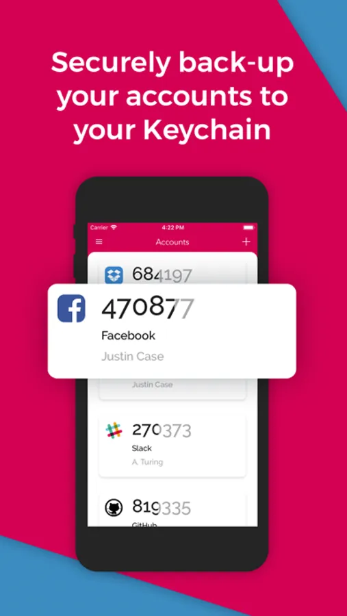 Using this app you can finally backup your accounts to your keychain, so switching to a new phone will be seamless. Never again reset 2FA on all your accounts when you buy a new phone!