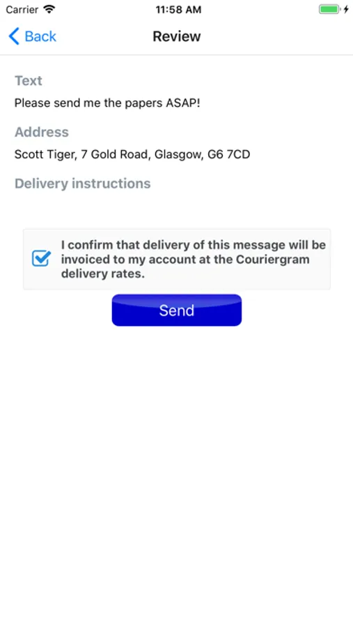 The Couriergram App allows you to send messages to any address in the UK within 2 hours. Compose, store and send your Couriergram messages. Requires a Couriergram account, which is free to open, to use the Couriergram message delivery system.