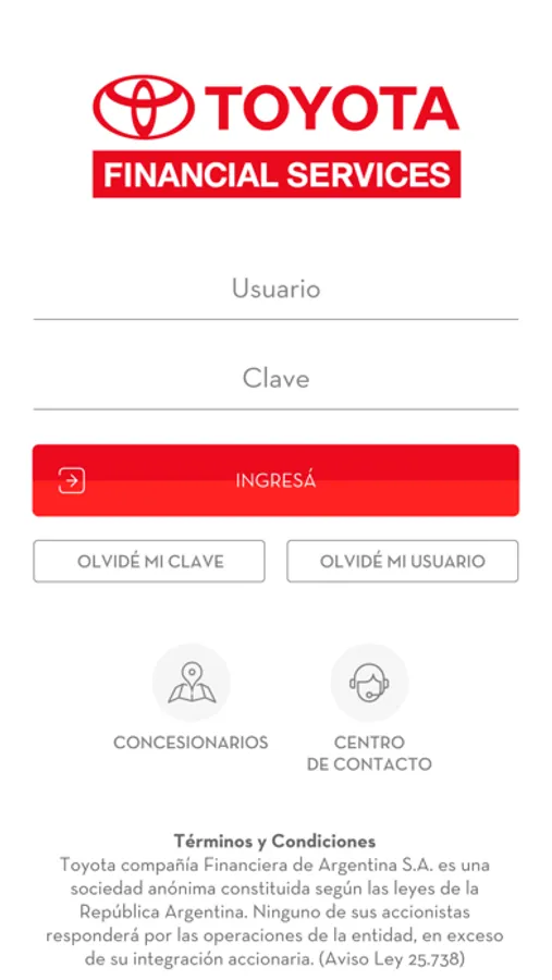 Para acceder debes utilizar el usuario y clave con los que ingresas a nuestro sitio web. Si todavía no tenés tu usuario, por favor registrate en www.toyotacfa.com.ar > Acceso a Clientes > Registrarme y completá los pasos queindica el sistema.