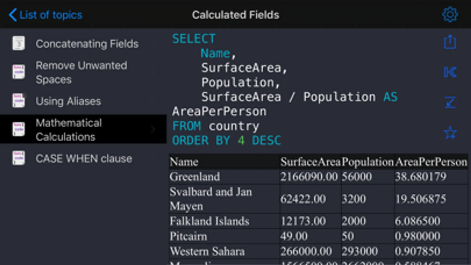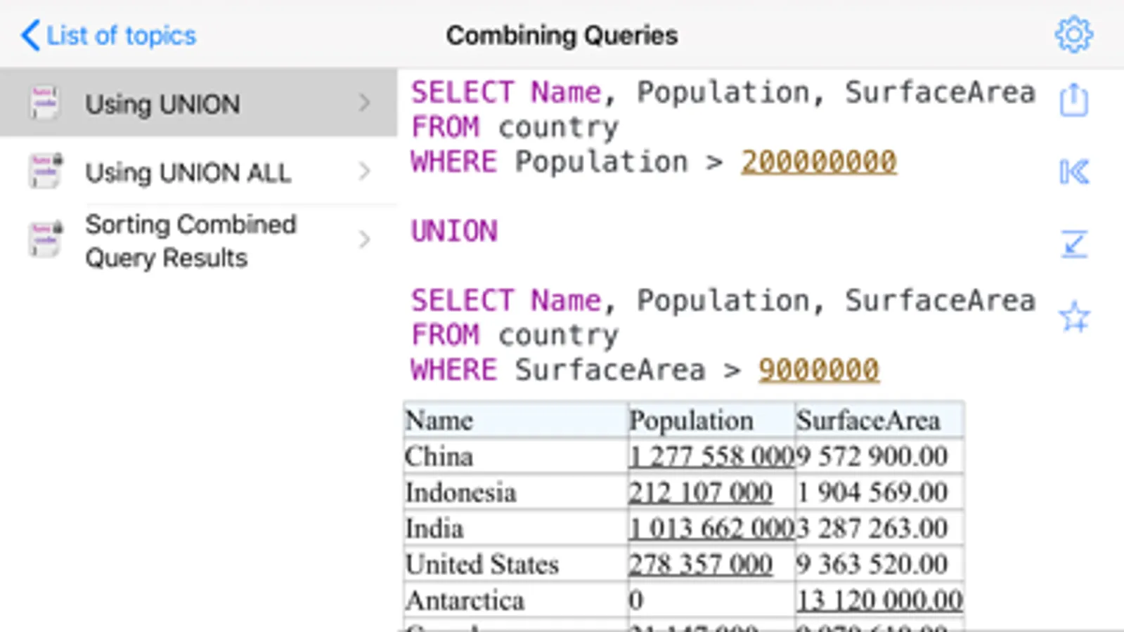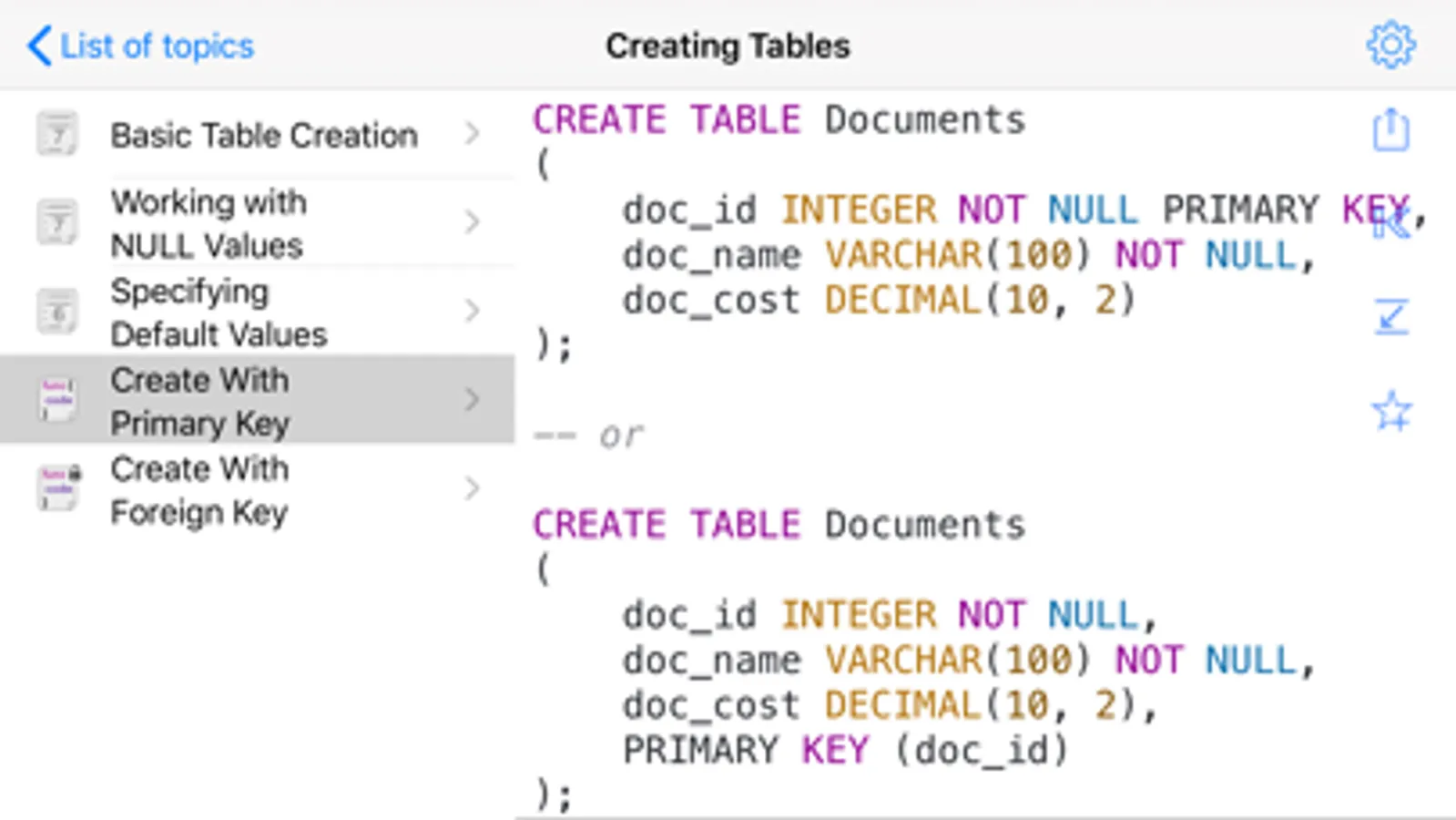• The application is a good tool during the exam or the preparation to the interview because it contains a reference to frequently used operations in SQL.