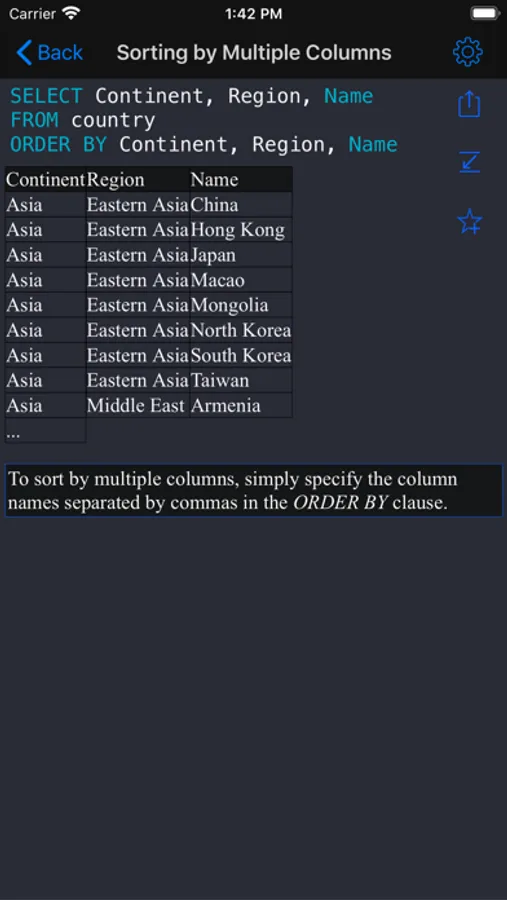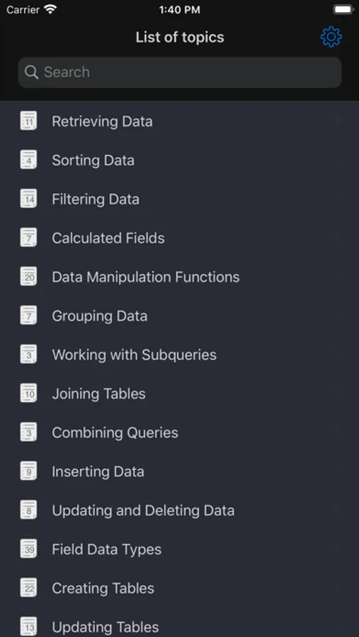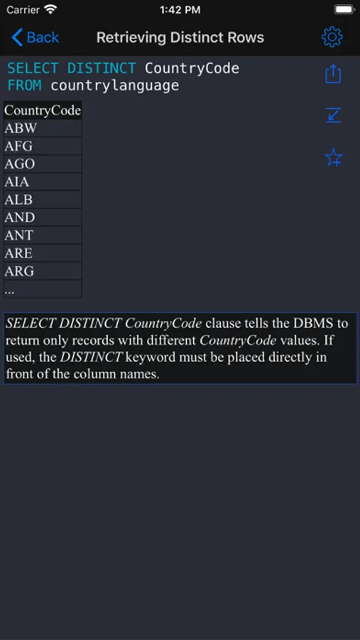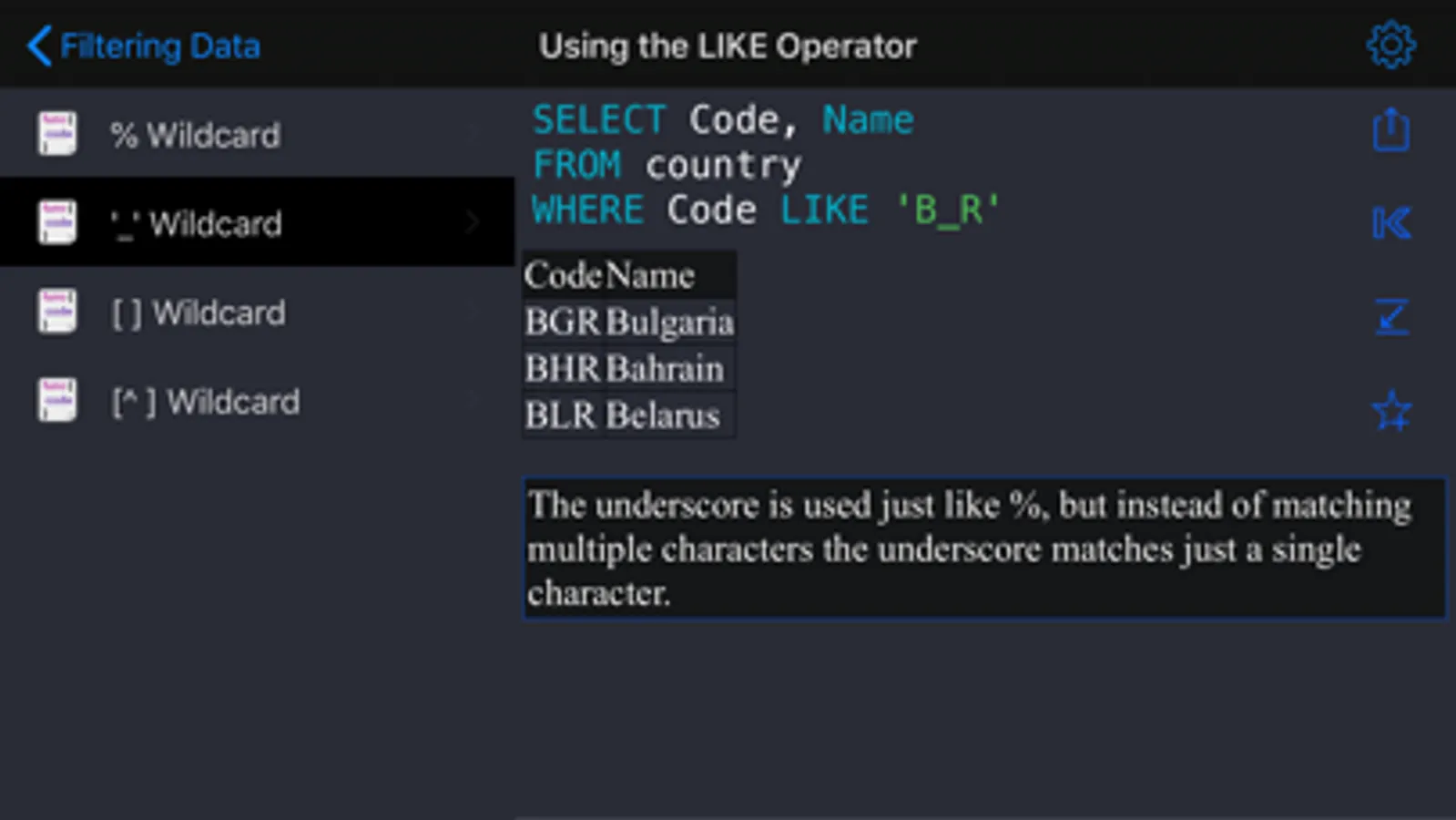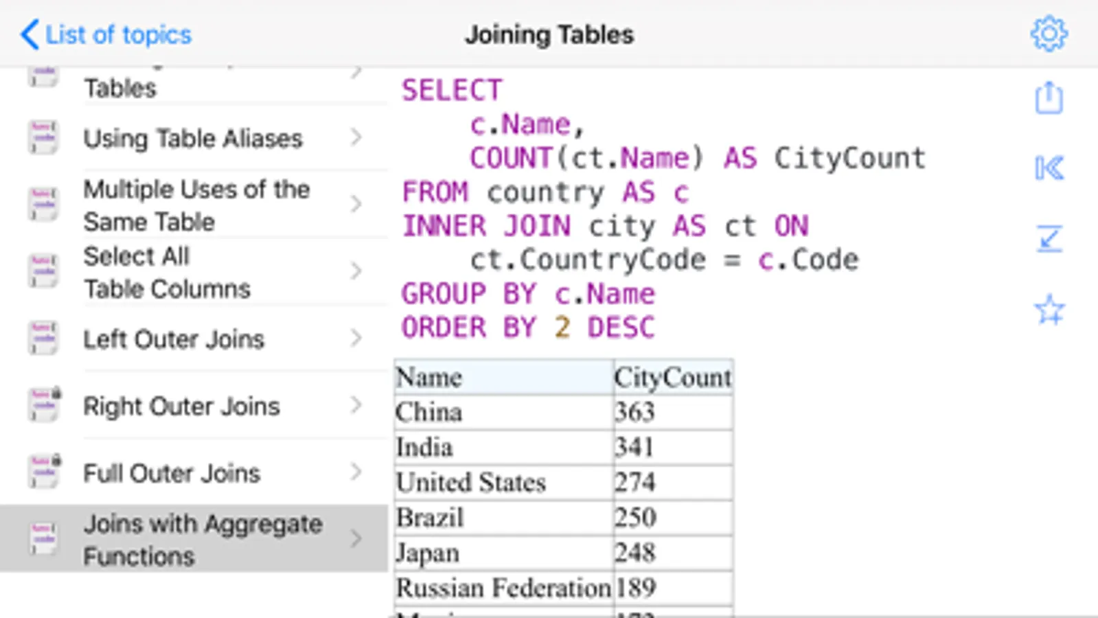 • The application is a good tool during the exam or the preparation to the interview because it contains a reference to frequently used operations in SQL.