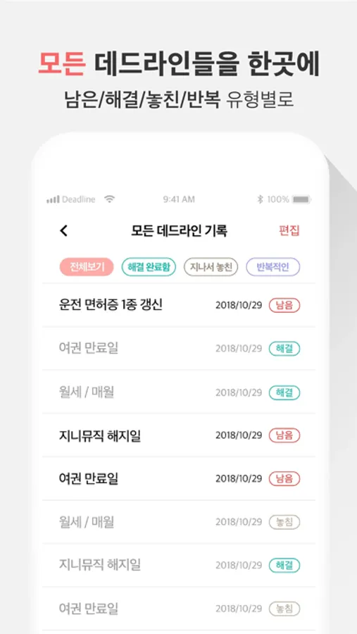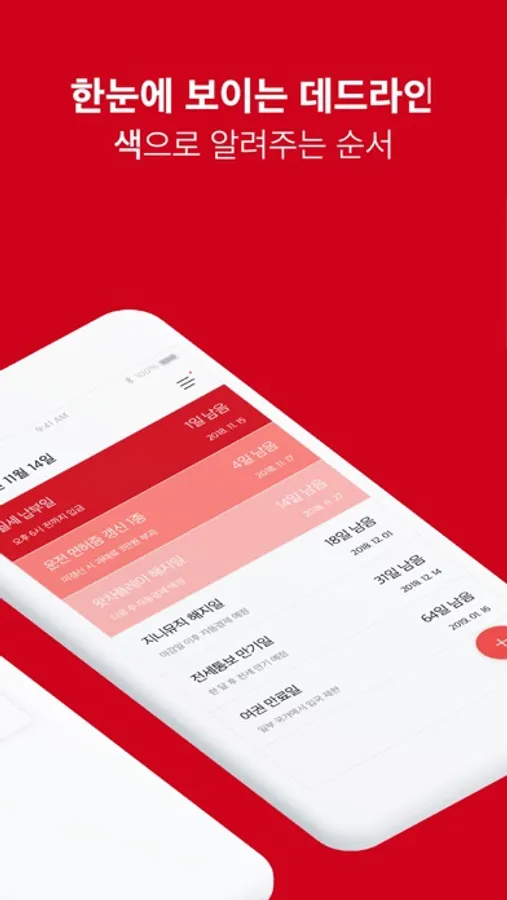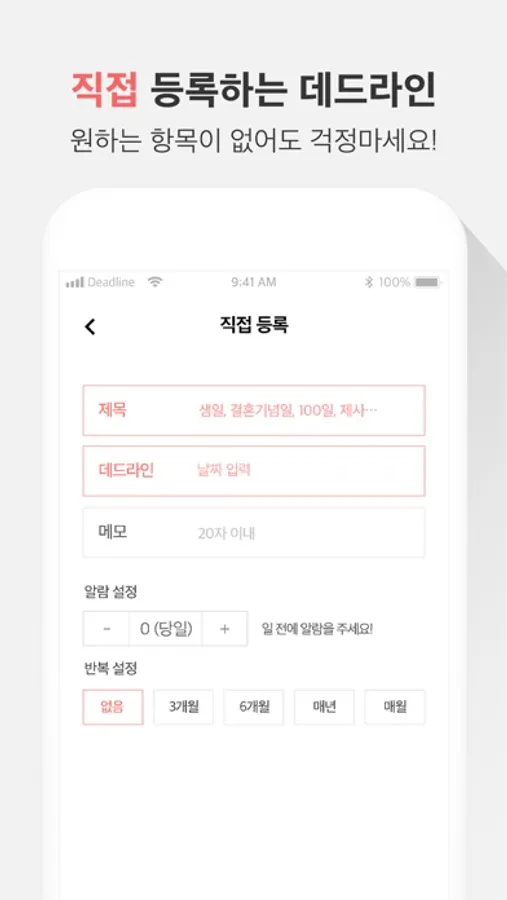 미팅, 발표, 서류/보고서 제출, 생일, 결혼기념일, 가족행사까지 데드라인 앱에서 관리하세요!